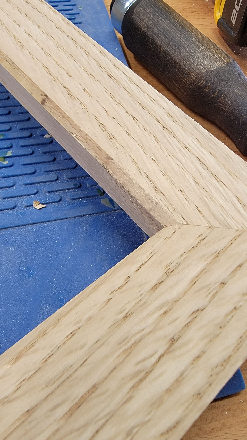 Made from solid red oak, finished with Rubio Monocoat White hard wax oil, this set contains 3 custom designs, featuring shared visual elements: large and small chamfers, steep angles, and walnut spline accents. The bench uses dowel joinery and a solid oak slab for the top. The frame repurposes an old mirror and uses splined miters and a French cleat for flush mounting. The coat hooks pivot on a steel rod, with no visible joinery or mounting hardware, ending up flush with the wall and mirror appearing as a single unit.